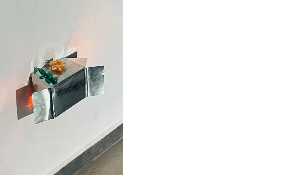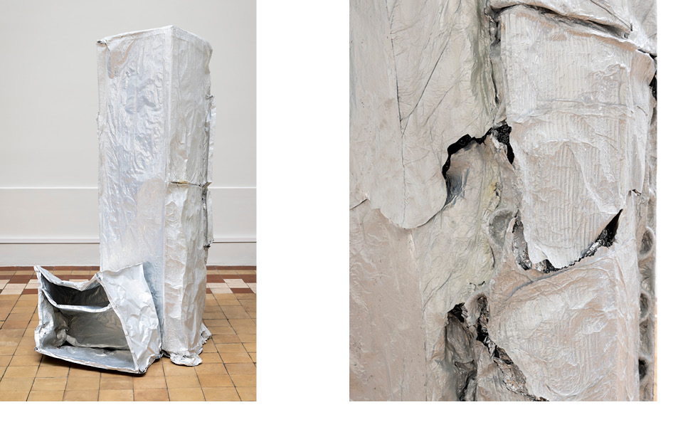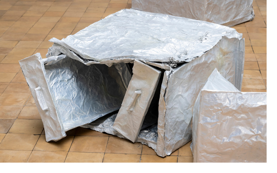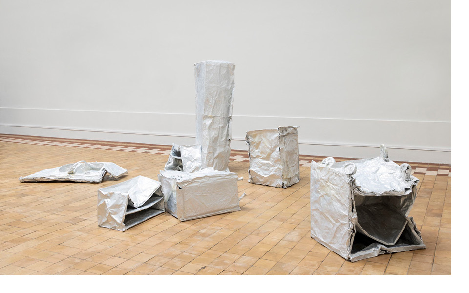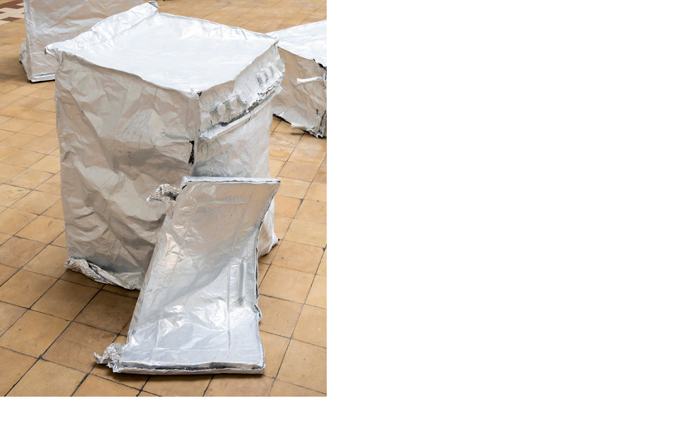 SUNBIT BOUILLON (CUBOIDAL AND CRUMBLING) (2023), aluminium foil & glue, variable dimensions