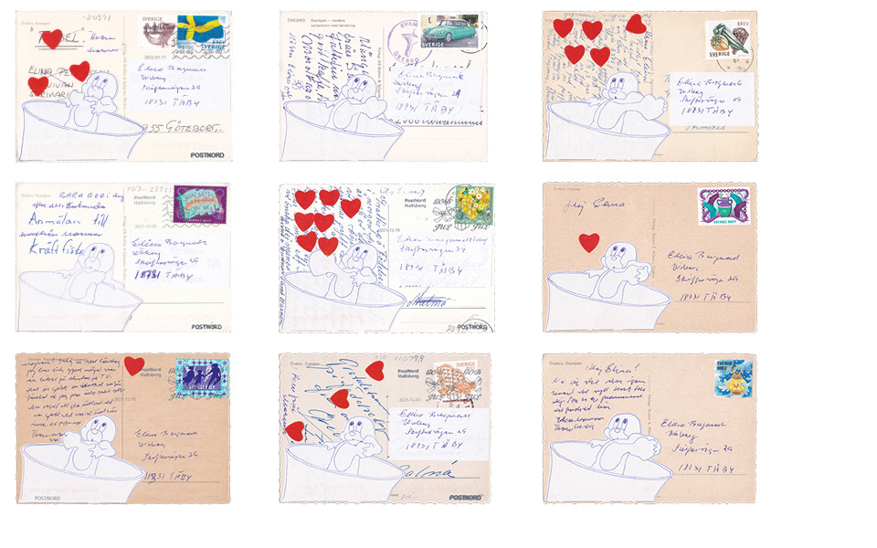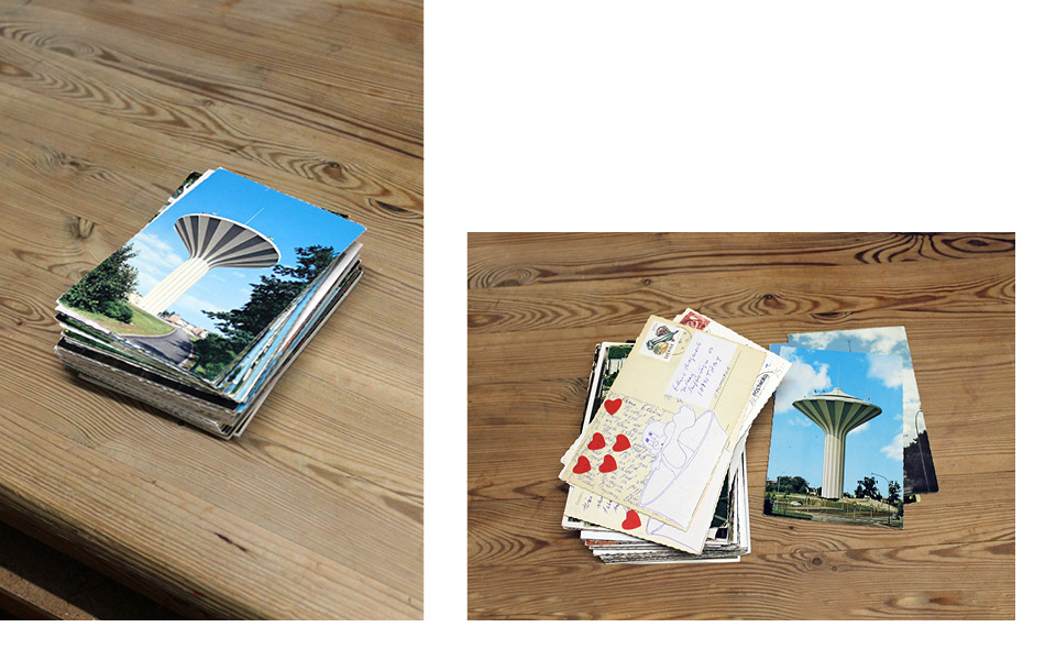 HEART BEATS OUT OF CHEST (BA-BOOMP, BA-BOOMP, BA-BOOMP) (2022), a collection of postcards depicting the water tower Svampen & a correspondence between my grandmother and me, 10x15cm