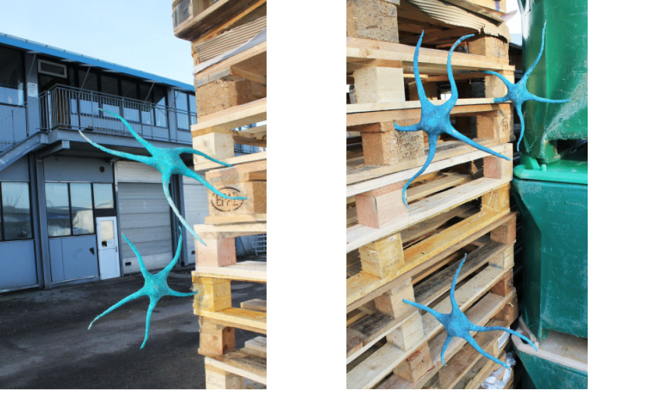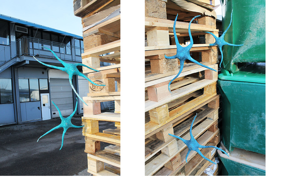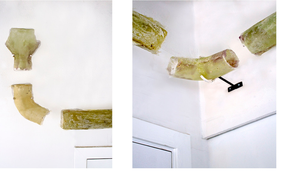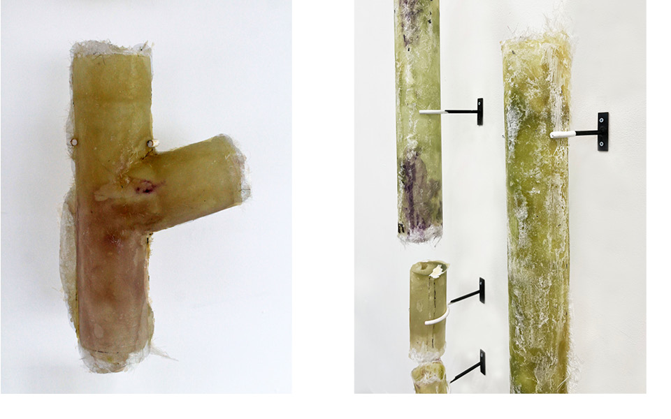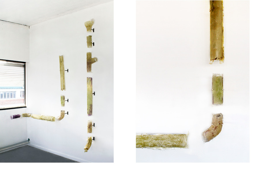 SLIPSTREAM (2022), polyester & fiberglass casts of my childhood home’s drainpipes, welded iron rods & plastidip, variable dimensions