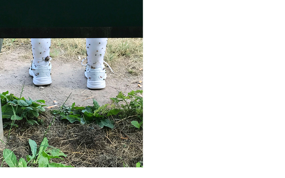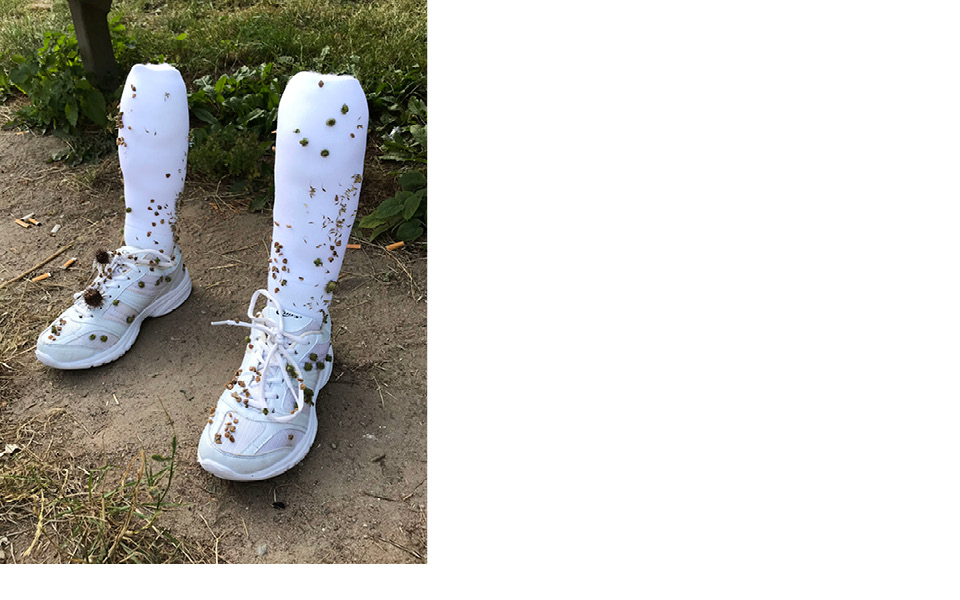 A RUN IN THE FOREST, AUTUMN (2021), trainers, training socks, polyester filling & epizoochory seeds, 32x40x27cm