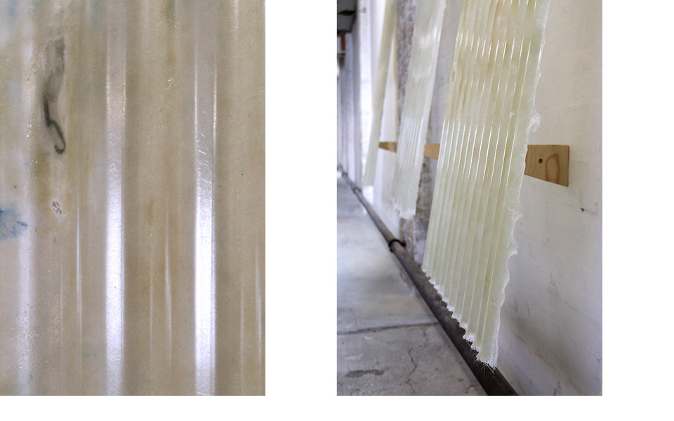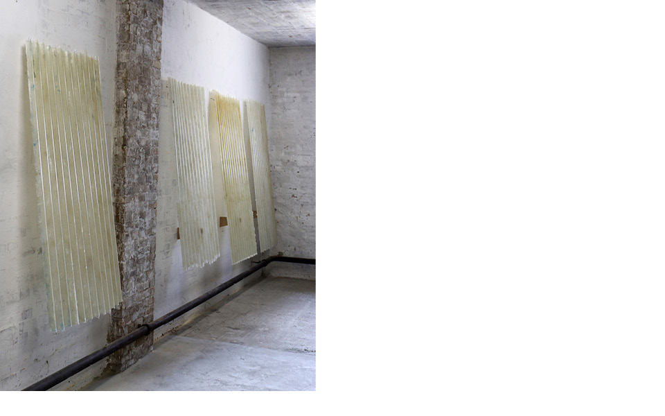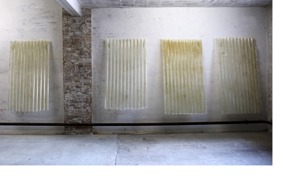 STATIC DRAPERY, SUN IN THE MIST/ STATIC DRAPERY IN THE SUN, NOON/STATIC DRAPERY, THAW, DUSK/ STATIC DRAPERY, MORNING EFFECT (2018), polyester, fiberglass, iron chains & wedges, 150x90cm & 170x90cm