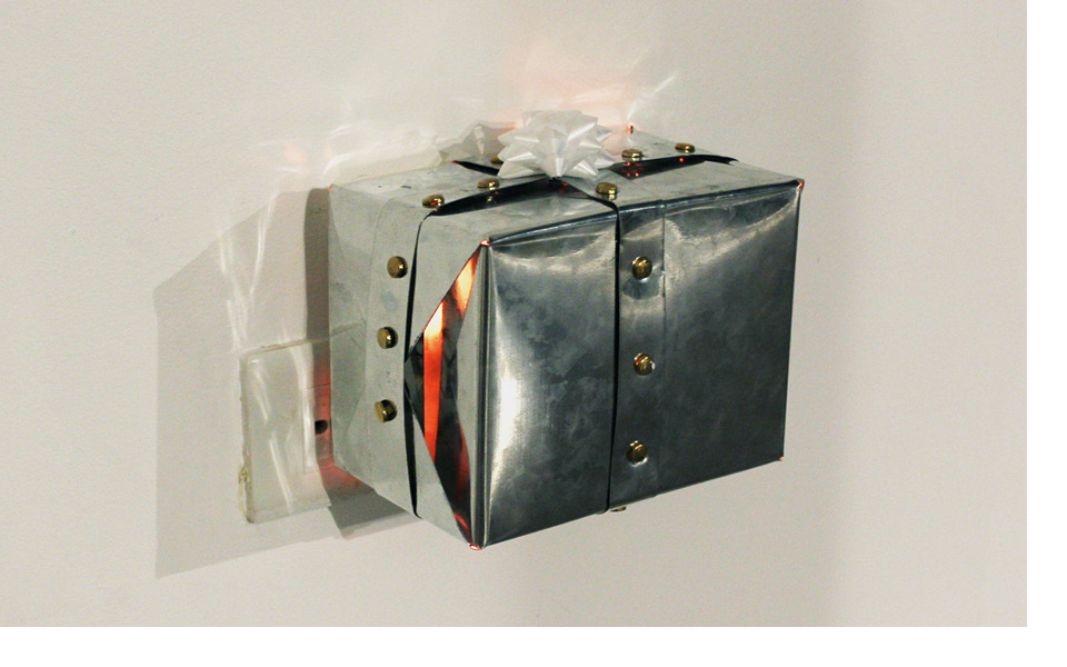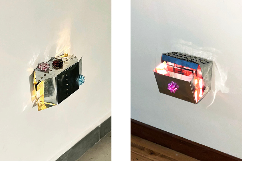 JIFFIES (2022), steel sheet, paper binders, night lights & bows, 15x22x12cm